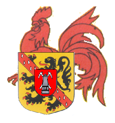 Armoiries de la Basse-Sambre : Un écu d’or au lion de sable, armé et lampassé de gueules, brisé d’une bande de gueules, semée de larmes d’argent et chargée, en cœur, d’un écu de gueules à une lampe de mineur de sable brochant sur deux pic d’argent passés en sautoir. L’écu sommé d'un cercle d'or est supporté par un coq hardi de gueules (coq Wallon).